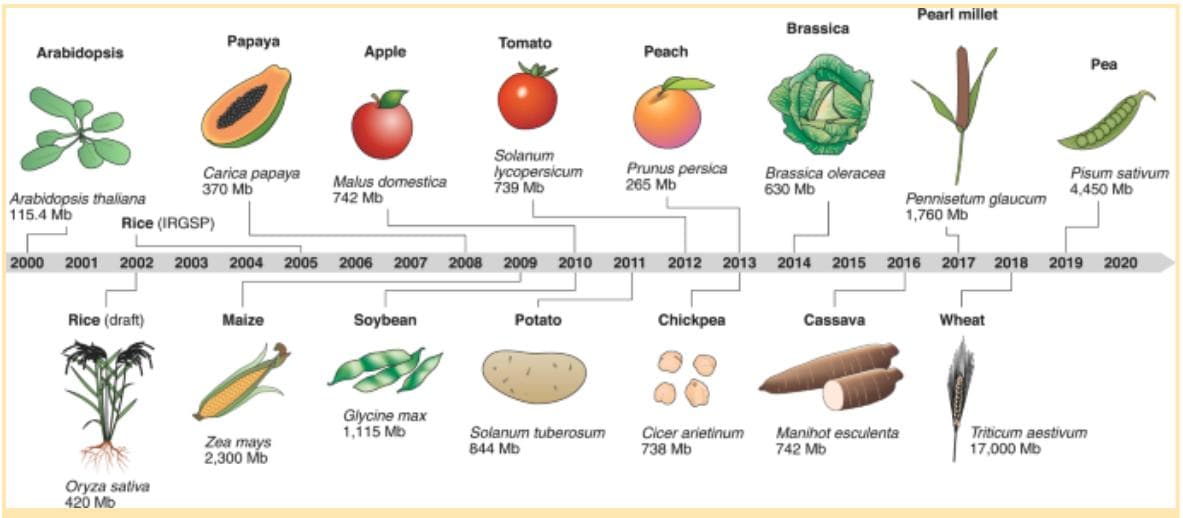 With next-generation sequencing technologies, several transcriptome sequencing projects have been completed for the Hevea brasiliensis species. Through these projects, we have found that “approximately 78% of the genome was repetitive DNA” (Thottathil). Additionally, a “total of 68,955 gene models were predicted, of which 12.7% are unique to [Hevea brasiliensis]” (Thottathil). We have been able to identify important genes of the species like which ones are associated with rubber synthesis and disease resistance. The genomic information provided a good foundation for crop improvement of this species; this crop now has an increased yield and less susceptibility to diseases because of this valuable information. (Hevea brasiliensis picture from keys.lucidcentral.org) One of the most practiced methods of agriculture is plant breeding. Applying DNA sequencing to crop science can allow farmers and scientists to identify and exploit genetic variations in other plants. “Identification of the key genes underlying a trait enables the transfer of the trait to another cultivar or species by genetic modification; alternatively, these traits may be incorporated into a cultivar by marker-assisted selection” (Edwards & Batley 2010). A number of crops have been sequenced (Table 1), and the data we have obtained from them can help immensely with the cultivation of more crops in the future.