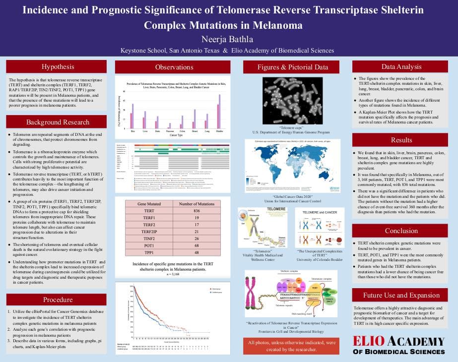 I am a high school student at Keystone School in San Antonio, Texas. My project comprehensively investigates the role of TERT and telomere biology in Melanoma by examining the intricate relationship between telomerase, and shelterin complex genes in human genomic data. Through ERP, I enjoyed learning how to conduct scientific statistical analysis, use different biomedical databases, and enhance my knowledge and passion of biomedical research and the steps to conducting trials and creating new treatments and vaccines, among many other things. It has also helped me to develop an award winning science fair project and has inspired me for future projects. Through engaging, accommodating, and helpful instructors, who encouraged thinking and asking questions, I had an amazing opportunity to develop my identities as a student and researcher. Elio Academy has been a part of my life for the past two years, I participated in a summer program for two weeks and subsequently was part of the ERP in Fall 2023. I am so grateful for all of the opportunities in biomedical research that it has given me.