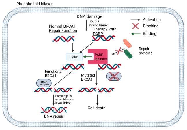 Illustration of functional BRCA1 repair and mutated BRCA1 therapy with PARP inhibitors(Figure representation created by the author: Rishika Banthia)